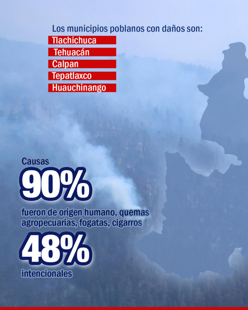 Los principales municipios impactados fueron Tlachichuca con 85.64 hectáreas, Tehuacán con 12 hectáreas, Calpan con 8.5 hectáreas, Tepatlaxco con 7.5 hectáreas y Huauchinango con 4.5 hectáreas, entre un total de 15 municipios.