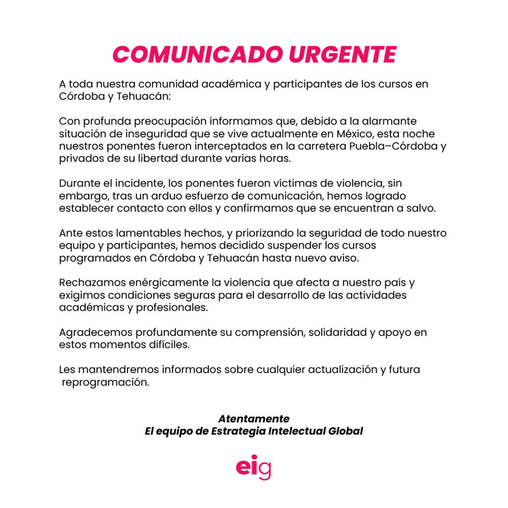 La organización Estrategia Intelectual Global (EIG México) anunció la suspensión indefinida de sus actividades académicas en Puebla y Veracruz, luego de que un grupo de sus docentes fue víctima de robo con violencia y privación ilegal de la libertad sobre la autopista Puebla-Veracruz.