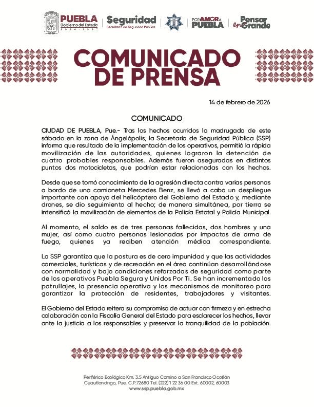 La madrugada de este sábado 14 de febrero, la zona comercial de la Isla de Angelópolis fue escenario de un ataque armado frente al establecimiento “Sala de Despecho”. El saldo preliminar es de tres personas fallecidas —dos hombres y una mujer— y cinco personas lesionadas, quienes ya reciben atención médica por impactos de bala.