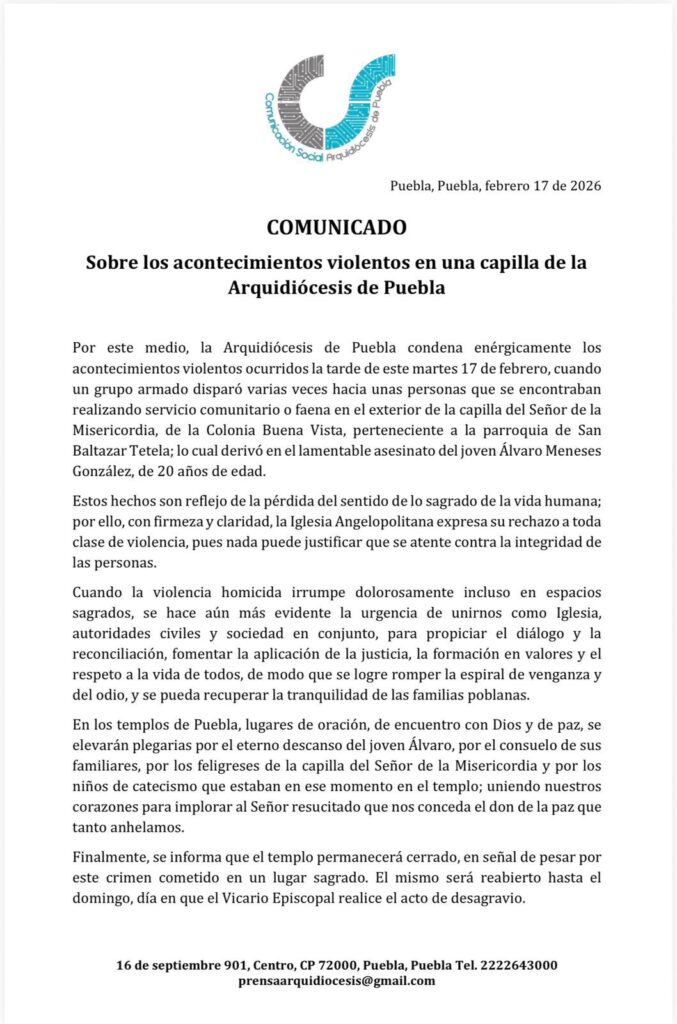 La Arquidiócesis de Puebla emitió un enérgico comunicado condenando lo que calificó como una “pérdida del sentido de lo sagrado”. La institución subrayó que nada justifica un atentado contra la vida humana, especialmente en un espacio dedicado a la fe y la comunidad.