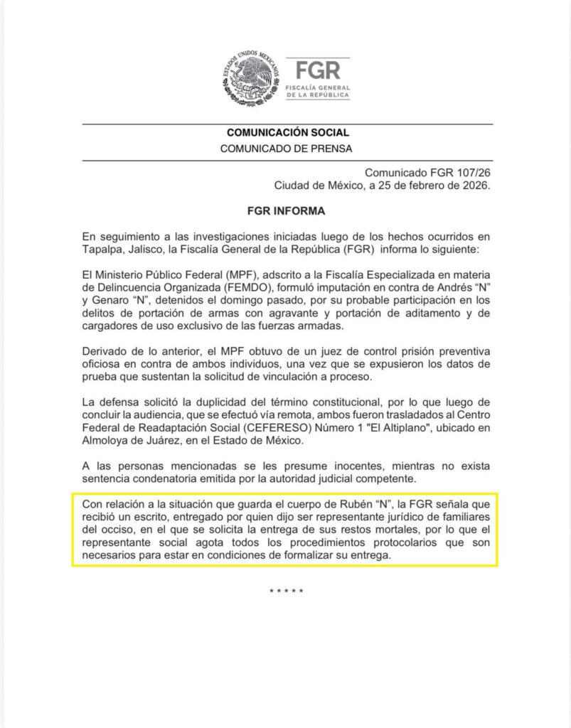 FGR confirma solicitud para entregar restos de “El Mencho”; el cuerpo permanece bajo resguardo