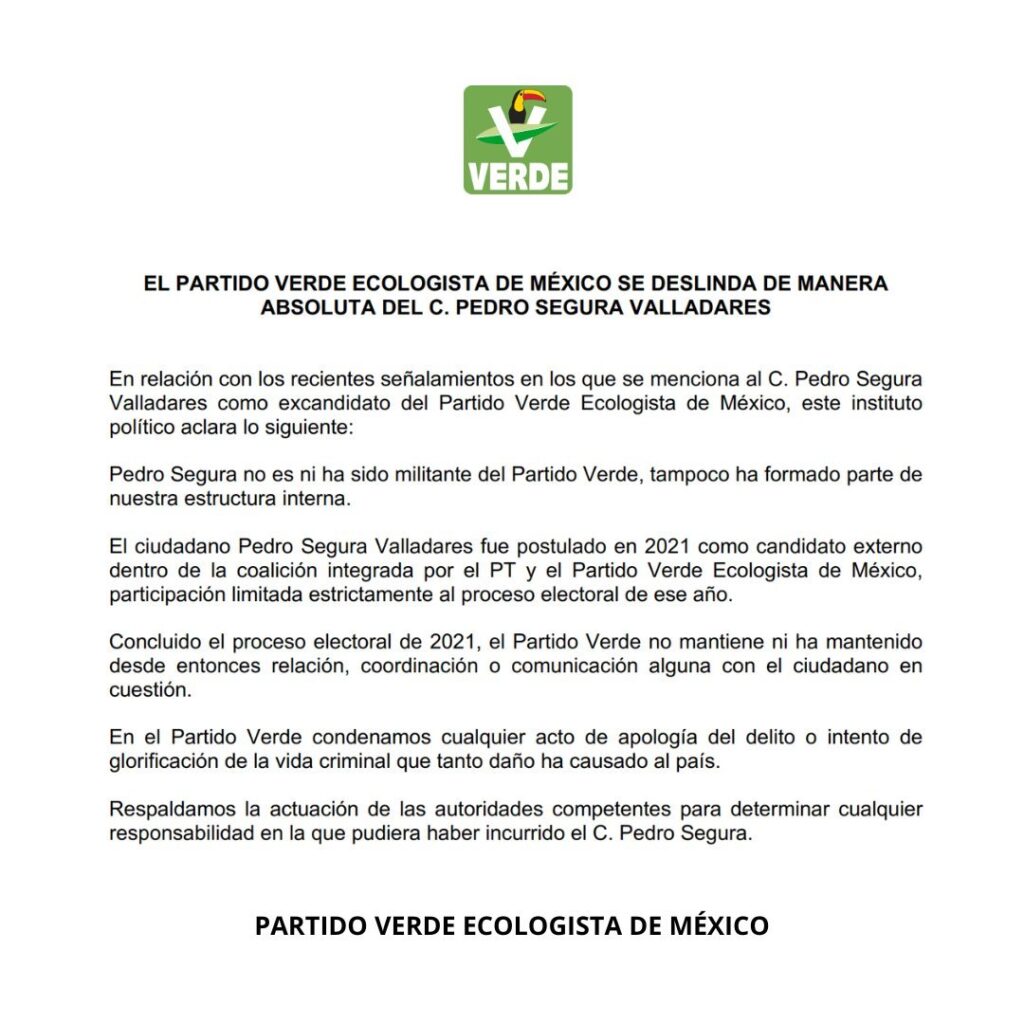 El PVEM condenó enérgicamente cualquier intento de glorificación de la vida criminal y reprobó la violencia ejercida contra la libertad de expresión. Asimismo, el instituto político solicitó a las autoridades competentes tomar las medidas necesarias para determinar las responsabilidades legales en las que pudiera haber incurrido Segura Valladares, especialmente tras recordarse que el excandidato ya había sido detenido previamente por la FGR por presuntos vínculos con la delincuencia organizada.