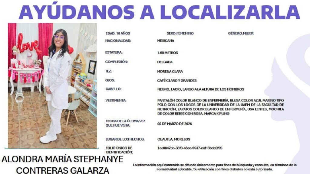 Una tercera estudiante de la misma institución continúa desaparecida, lo que ha generado preocupación entre familiares y la comunidad universitaria. Se trata de Alondra María Stephanye Contreras Galarza, de 18 años y estudiante de la Facultad de Nutrición de la UAEM.