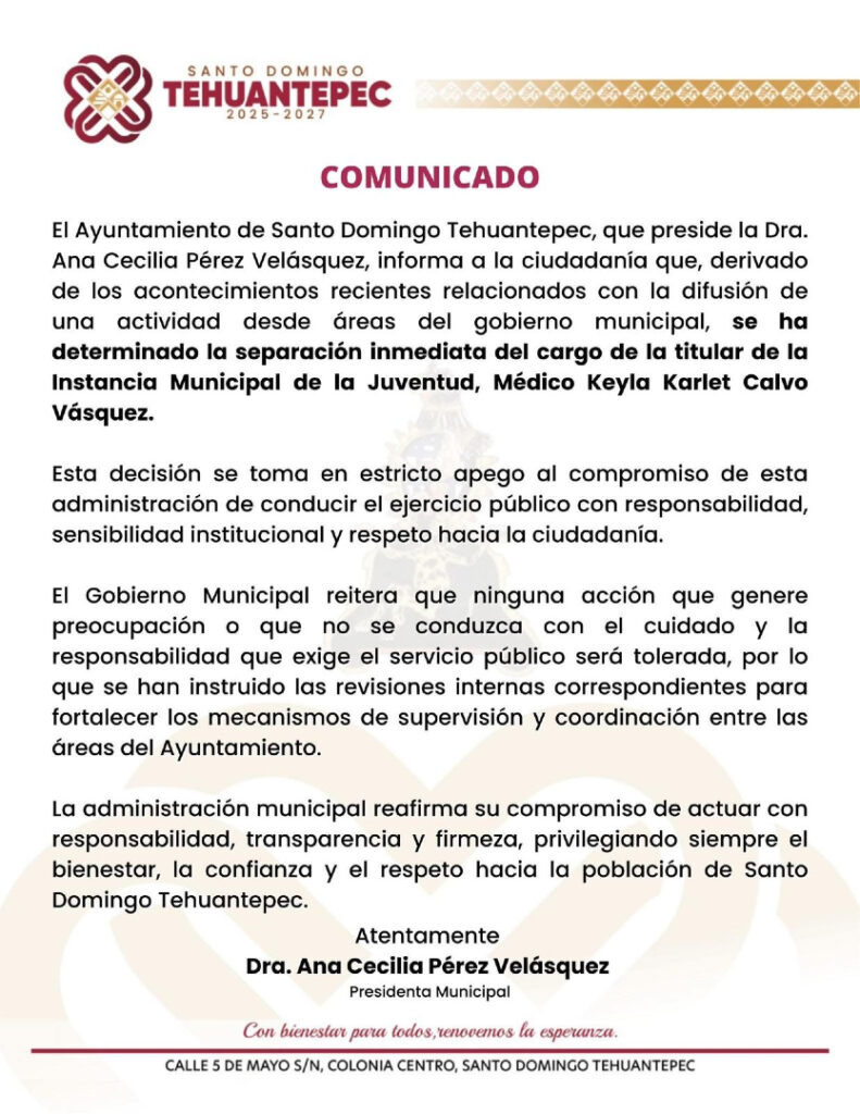 Casi de manera simultánea, en Santo Domingo Tehuantepec surgió otra polémica tras la convocatoria a un taller denominado “Kit forense en caso de desaparición”; la actividad fue duramente criticada por normalizar la tragedia de las desapariciones en lugar de proponer políticas de prevención o seguridad. Ante la presión de colectivos y la ciudadanía, el ayuntamiento eliminó la publicación, ofreció disculpas y destituyó a Keyla Karlet Calvo Vásquez, funcionaria responsable de la organización del taller.