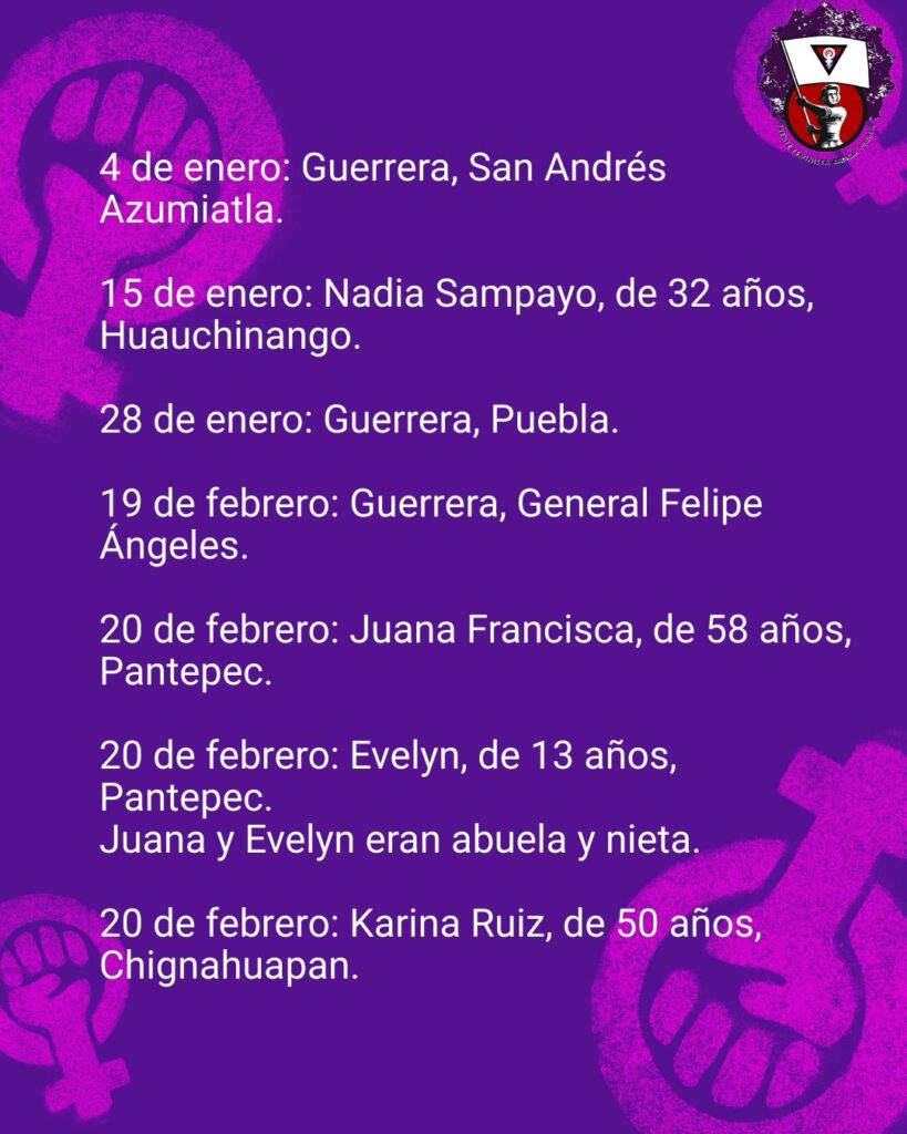 Para el mes de febrero, la organización contabilizó cuatro casos más: uno el 19 de febrero en Felipe Ángeles y tres el 20 de febrero en los municipios de Pantepec y Chignahuapan.