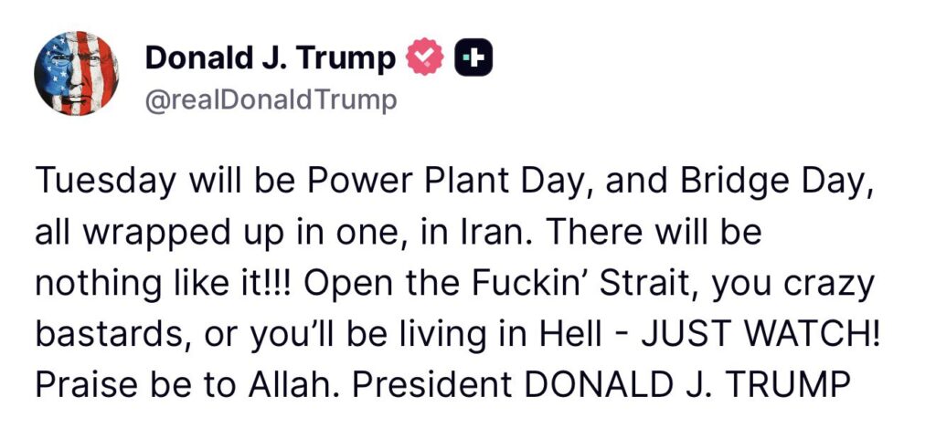 “Abran el maldito estrecho, locos bastardos, o estarán viviendo en el infierno”, escribió el mandatario en su mensaje, junto a las palabras “El martes será el día de la planta de energía y el día del puente, todo junto, en Irán. ¡No habrá nada igual! […] Alabado sea Alá”.