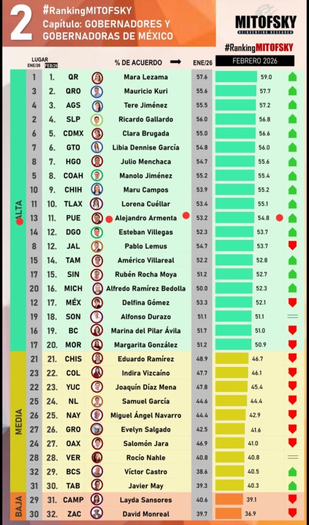 Según el más reciente Ranking Mitofsky de febrero de 2026, el panorama político en Puebla muestra una consolidación de la marca Morena en Puebla, pues los niveles de aprobación se registraron positivos para sus tres órdenes de gobierno.
