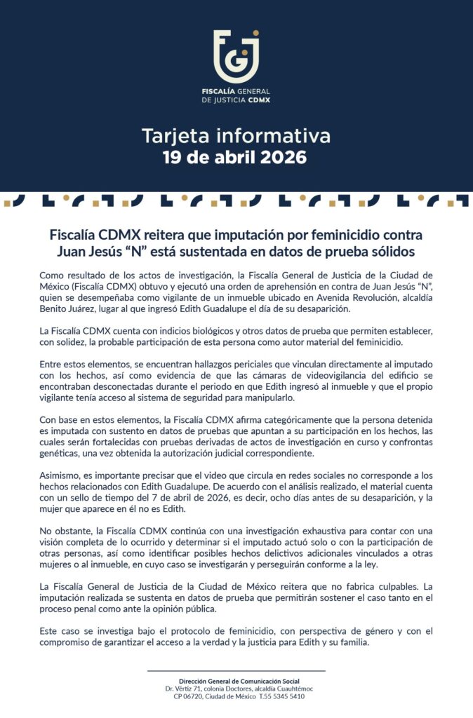 El proceso judicial por el feminicidio de la joven Edith Guadalupe ha entrado en una fase de confrontación de evidencias; tras la difusión de un video por parte de la defensa de Juan Jesús “N”, con el que se buscaba señalar a un posible sospechoso alterno, la Fiscalía General de Justicia de la Ciudad de México (FGJCDMX) aseguró que dicho material no guarda relación con el crimen, debido a que las fechas y las personas implicadas no coinciden con los hechos ocurridos el 15 de abril.